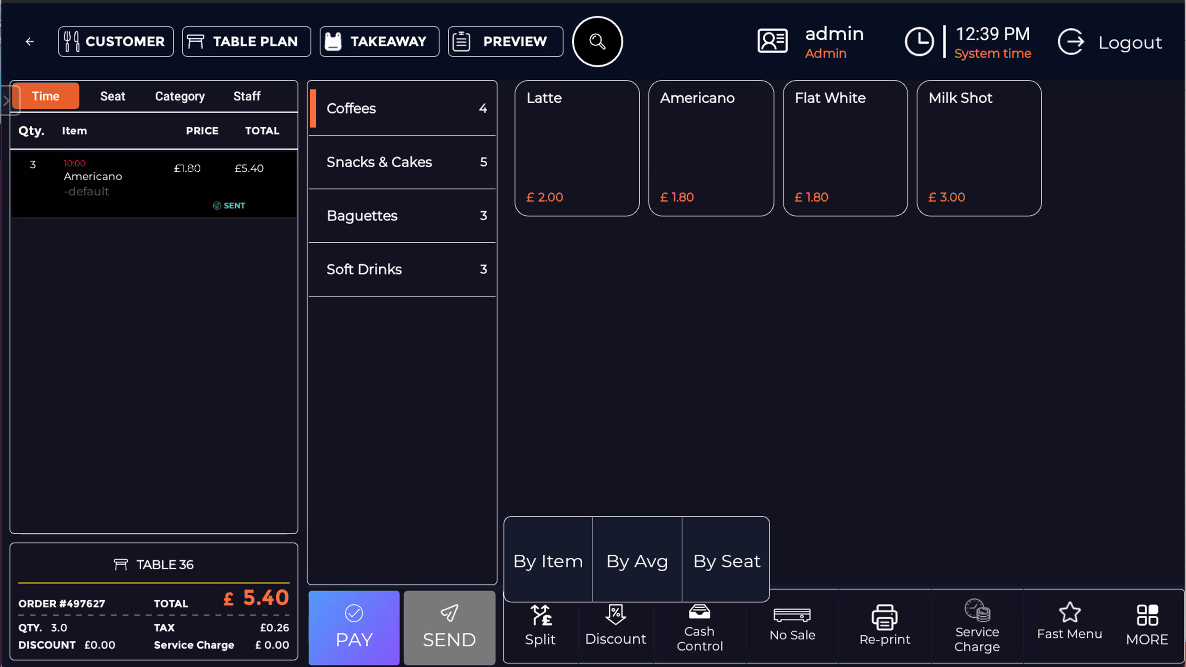 This page will explain how to use the Split Bill function. The function can only be used once the order has been sent, and is saved to a tab or table. When at this stage, press Bill Split