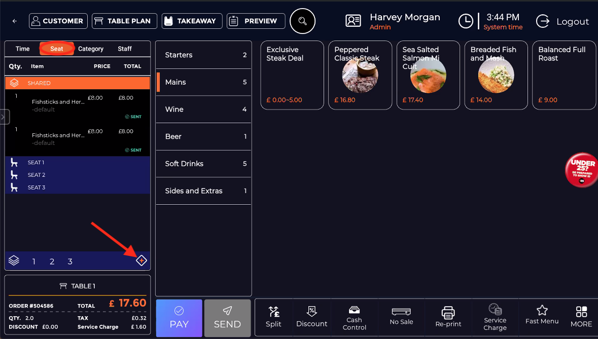 If you select Seat 1 you can then add menu items and they will then be specifically billed to that guest, see below...